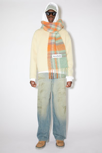 Acne Studios orange/lilac/aqua blue tartan scarf is made of a soft mohair blend with fringed ends, made from carefully selected material known for its soft and hairy fibres. Detailed with an Acne Studios embroidered logo. - Tartan - Embroidered logo - Fringed ends - Soft wool/mohair blend - Measurements including fringe: 250 cm x 28 cm - Fringe measurements: 12 cm approx. - Made in Italy - Style ID: FN-UX-SCAR000329 - Due to the characteristics of the material, it is natural for small fibres to shed over time. Handle with care to preserve the original appearance as long as possible. - Shell: 33% Alpaca, 25% Wool, 22% Nylon, 20% Mohair