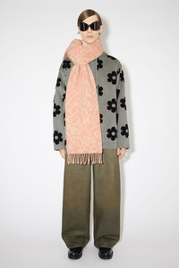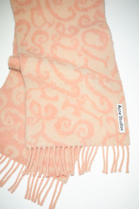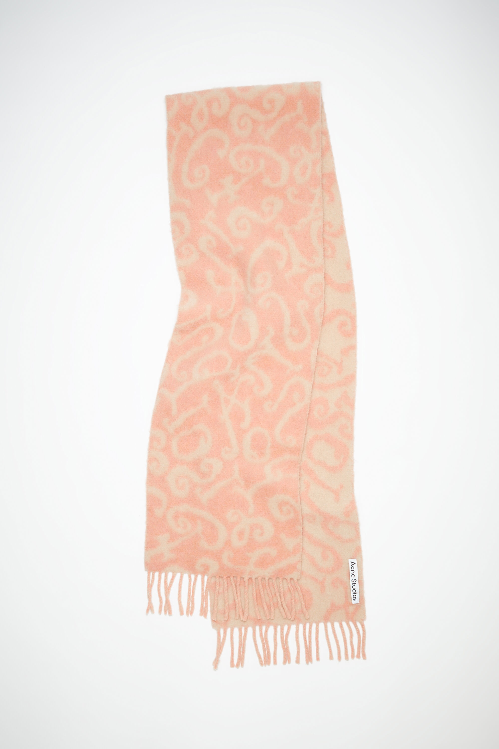 Acne Studios pink/light pink scarf features a tonal monogram jacquard, crafted from a wool and alpaca blend with a hairy brushed finish and short frayed edges. - Monogram jacquard - hairy brushed finish - Frayed edges - Measurements: 29 cm; 200 cm - Style ID: FN-UX-SCAR000293 - Shell: 50% Wool, 30% Alpaca, 20% Nylon