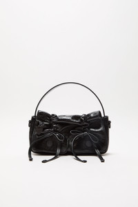 Multipocket micro bag is crafted from leather with a smooth shiny finish and laced knot details. Complete side flap pocket with a discrete magnetic closure and spacious interior. Includes a top handle and long strap. - Multipocket construction - Smooth shiny leather - Front knot details - Two side pockets - Top handle - Measurements: 12 cm; 22 cm; 6.5 cm - Crossbody strap: 110 cm - Short strap: 50 cm - Protective dustbag - Made in Italy - Style ID: Multipocket Micro Crossbody Lux - Shell: 100% Calf leather, Lining: 50% Polyurethane, 50% Polyester