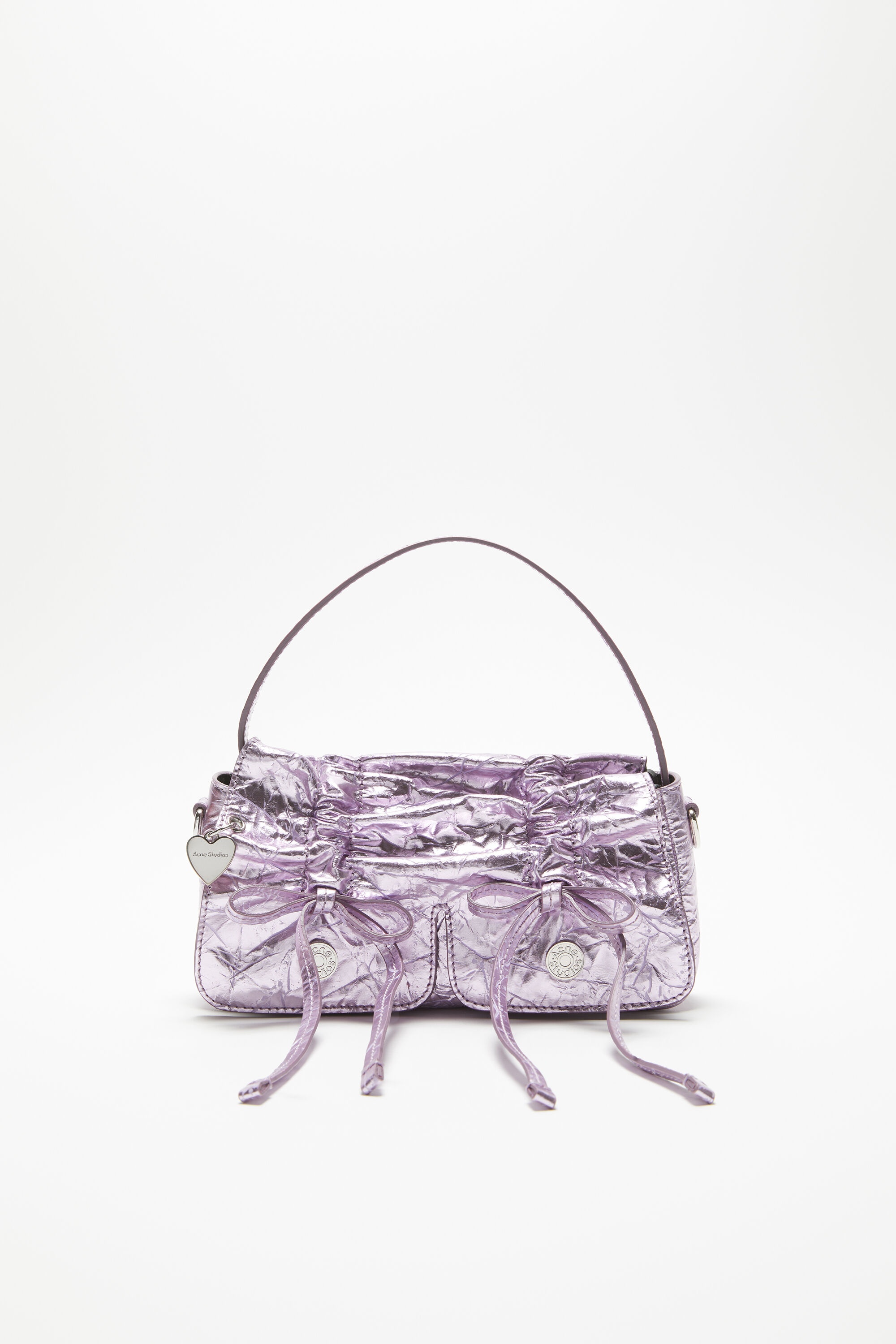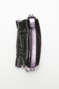 Multipocket micro bag is crafted from laminated crinkled leather and laced knot details. Complete side flap pocket with a discrete magnetic closure and spacious interior. Includes a top handle and long strap. - Multipocket construction - Laminated crinkled leather - Front knot details - Two side pockets - Top handle - Measurements: 12 cm; 22 cm; 6.5 cm - Crossbody strap: 110 cm - Short strap: 31 cm - Protective dustbag - Made in Italy - Style ID: Multipocket Micro Crinckled Metallic - Lining: 50% Polyurethane, 50% Polyester, Shell: 100% Goat leather