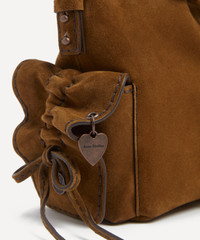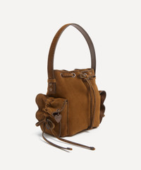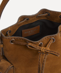 DETAILS Mini bucket bag Suede Multi-pocket construction Top handle Adjustable shoulder strap Drawstring top with magnetic closure Two side flap pockets Antiqued metal hardware COMPOSITION & SIZE 100% Calf Leather Lining: 50% Polyester; 50% Polyurethane H: 18cm, W: 16cm, D: 10cm Strap drop: 52cm