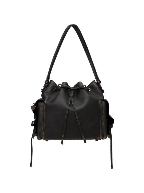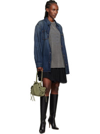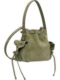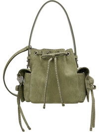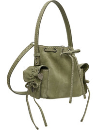Calfskin suede top handle bag. · Detachable carry handle · Detachable shoulder strap · Bow at face and sides · Logo charm at side · Ruched flap pocket at sides · Drawstring closure at throat · Faux-leather interior · Logo-engraved silver-tone hardware · Contrast stitching in beige · H7.25" x W9" x D4" Supplier color: Herb green Calfskin. Made in Italy 252129F046019