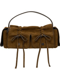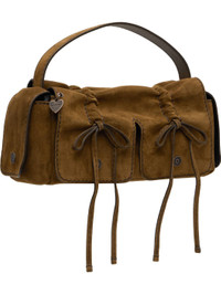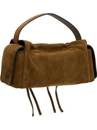 Suede top handle bag. · Logo embossed at adjustable shoulder strap · Detachable crossbody strap · Logo charm and drawstrings at face · Flap pocket at sides · Magnetic flap · Patch pocket at interior · H6" x W14" x D4.5" Supplier color: Cognac brown Leather. Made in Italy 261129F046014
