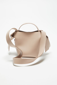 Mini shoulder bag is adorned with twisted musubi knots on each side, inspired by traditional Japanese obi sashes. Crafted from soft leather, detailed with an embossed Acne Studios logo. - Musubi knot - Debossed logo - Top handle - Detachable shoulder strap - Interior compartment - Snap button closure - Protective dustbag included - Made in Italy - Measurements: 21,5 cm; 20,5 cm; 15,5 cm - Strap measurements: 130 cm full length - Style ID: Musubi Mini R - Shell: 100% Calf leather, Lining: 100% Lamb leather
