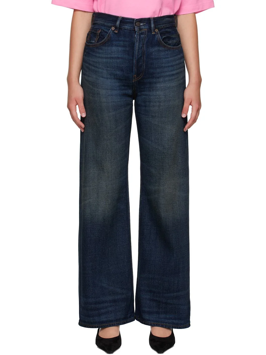 Non-stretch denim jeans. · Subtle fading and whiskering throughout · Wide, straight-leg · Mid-rise · Belt loops · Five-pocket styling · Button fly · Leather logo patch at back waistband · Contrast stitching in tan Supplier color: Dark blue 100% cotton. Made in Italy 252129F069034