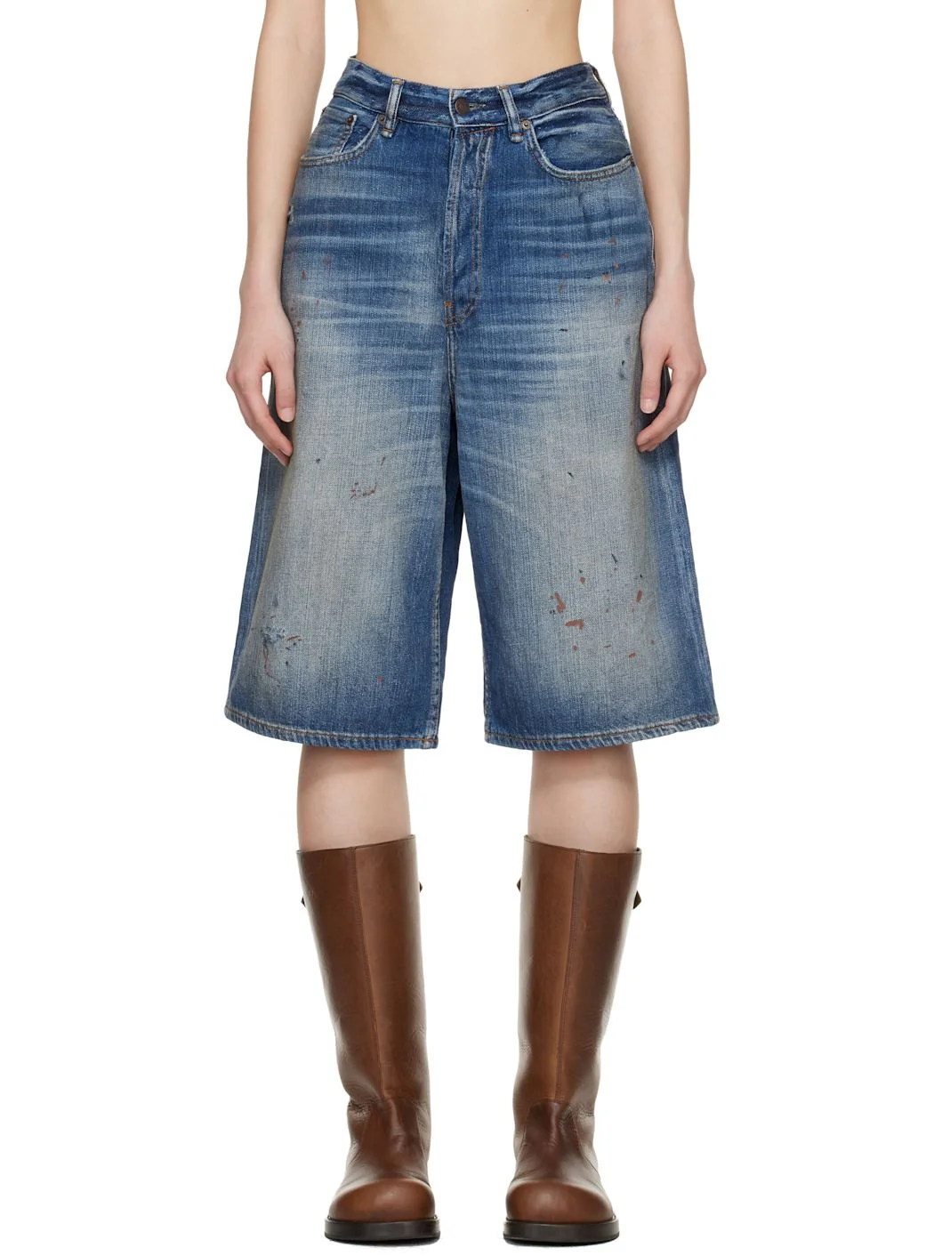 Non-stretch denim shorts. · Fading, whiskering, and distressing throughout · Paint splatter throughout · Straight-leg, loose-fit · Belt loops · Five-pocket styling · Button fly · Leather logo patch at back waistband · Contrast stitching in tan Supplier color: Mid Blue 100% cotton. Made in Italy 261129F088004