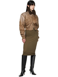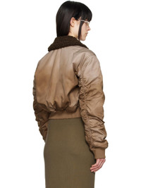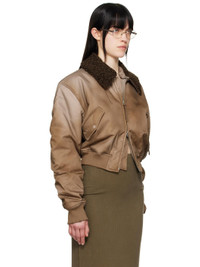 Insulated recycled nylon taffeta bomber jacket. Spray-dyed fading throughout. - Water-repellent - Detachable faux-shearling trim at spread collar - Logo-embossed zip pull at two-way zip closure - Flap pockets - Rib-knit hem and cuffs - Embroidered logo at utility sleeve pocket - Ruching at sleeves - Welt pocket at interior - Full satin lining Supplier color: Sand beige