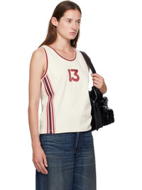 Cotton jersey tank top. · Striped rib-knit scoop neck and armscyes · Text applique at front and back · Striped knit trim at side seams · Logo embroidered at back Supplier color: Warm white 100% cotton. Made in Portugal 252129F111007