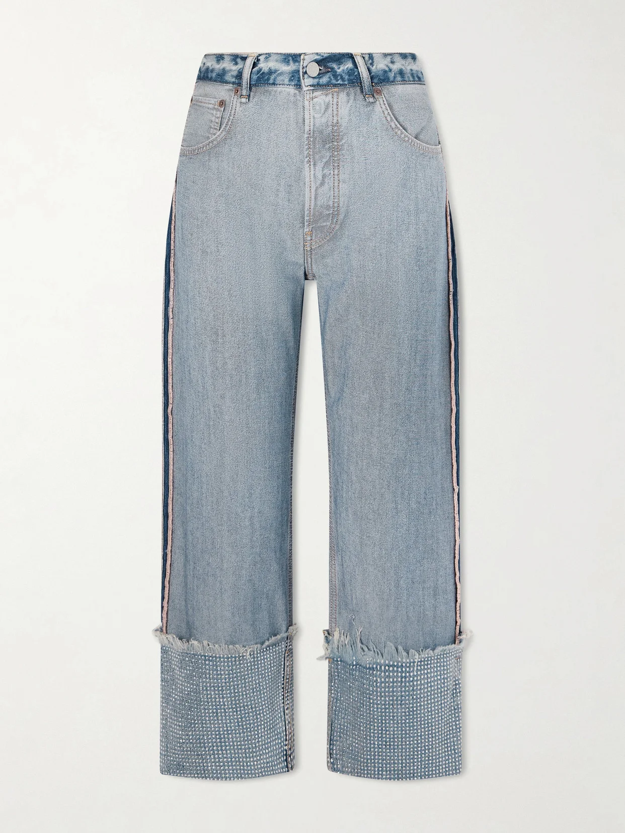 Acne Studios' straight-leg jeans strike a balance between undone edge and high-shine glamour. Cut from denim, they're detailed with frayed edges and crystal-embellished cuffs that catch the light with every step. Keep them in focus with a fresh white tee and sleek heels.
