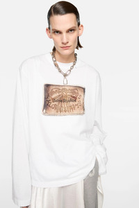 Crewneck long-sleeve T-shirt featuring a seasonal digital bow print, crafted from cotton jersey knitted with slub yarn for a subtly textured, vintage-inspired surface. Cut to a relaxed unisex fit and hip length. - Relaxed unisex fit - Hip length - Crew neck - Seasonal digital print - Female model is 178 cm / 5'8 and wears a size XS - Male model is 188 cm / 6'2 and wears a size M - Style ID: FN-UX-TSHI000214 - Made from organically grown cotton - Shell: 100% Cotton