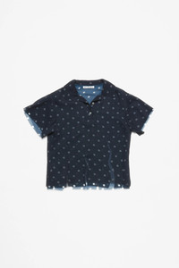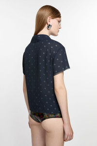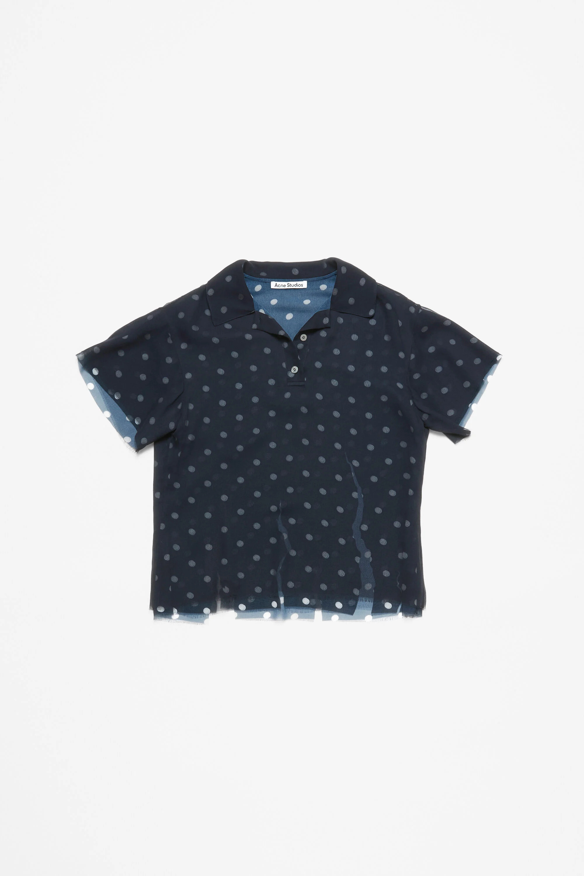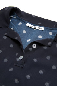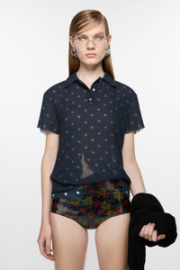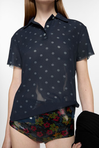 T-shirt blouse features seasonal polka dot artwork, adorned with shredded cuts and double-layered mesh construction. Designed with a polo style neckline and short sleeves. Cut to a regular fit with a waist length. - Regular length - Waist length - Double-layered mesh construction - Polo buttoned neckline - Model is 179 cm / 5'11 and wears a size 36 - Style ID: FN-WN-BLOU001130 - Shell: 51% Recycled polyester, 49% Polyester, Contrast: 100% Recycled polyester