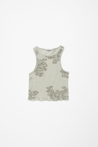 Sleeveless top features a seasonal lace digital print crafted from a cotton rib blend with an elasticated finish and smooth hand feel. Cut to fitted fit and waist length. - Fitted fit - Sleeveless - Waist length - Ribbed - Digital lace print - Model is 178 cm / 5′10 and wears a size 36 - Style ID: FN-WN-TSHI000677 - Shell: 95% Cotton, 5% Elastane