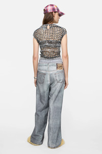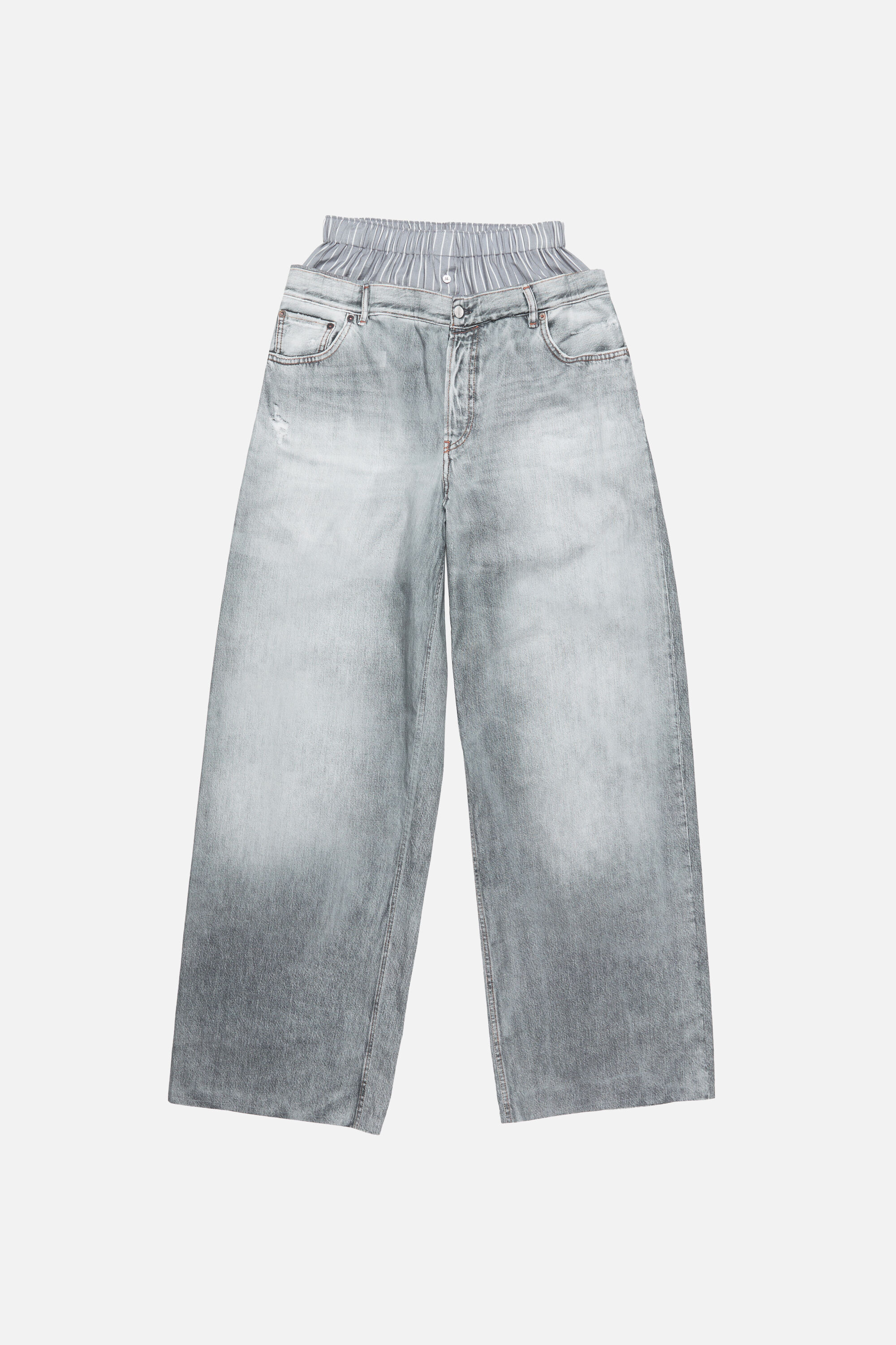 Trousers feature a trompe l'oeil denim-inspired print crafted in cotton poplin. Designed with a double waistband construction in contrasting pinstripe. Cut to a loose fit. - Loose fit - Trompe l'oeil print - Elasticated waistband - Double waistband construction - Side seam pockets - Model is 177 cm / 5'10 and wears a size 36 - Style ID: FN-WN-TROU001416 - Shell: 100% Organic cotton, Contrast: 100% Cotton