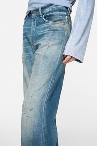 Jeans crafted from loosely constructed, lightweight slubby cotton denim with a vintage eco stone wash, featuring paint marks, holes, and dirt. Every garment will differ. 2021 jeans are cut to a regular fit with a mid waist, wide straight leg with a slight flare from the knee, and long length. - Regular fit - Mid waist - Wide straight leg with a slight flare from the knee - Long length - Paint marks, holes, and dirt. Every garment will differ. - Model is 178 cm / 5'8 and wears a size 27/34 - Style ID: Acne Studios 2021F Mid Blue Trafalgar - Made from organically grown cotton - Shell: 100% Cotton, Patch: 100% Cow leather