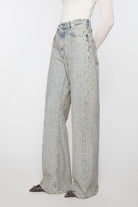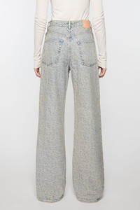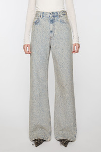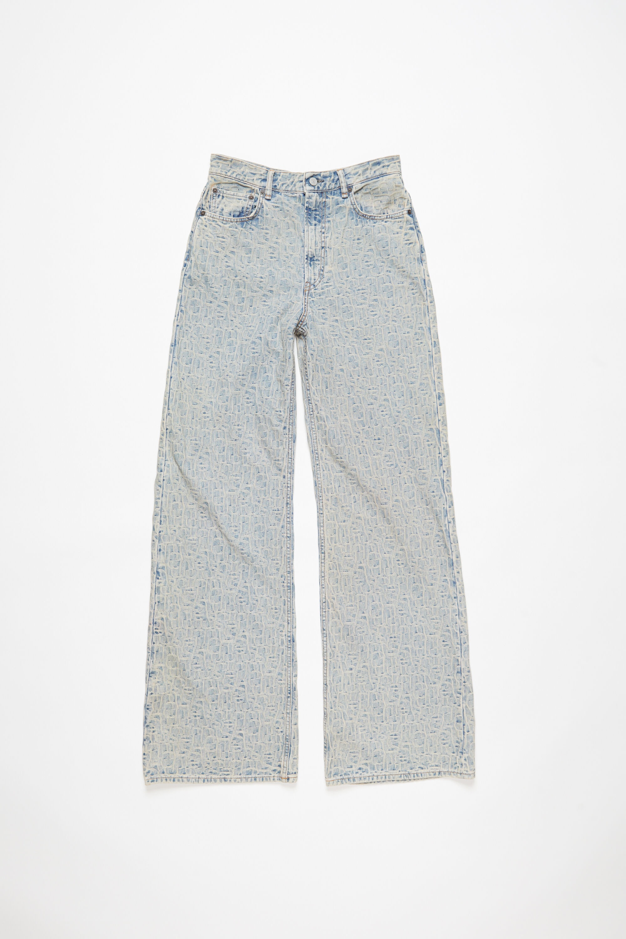 2022 jeans are cut to a relaxed fit with a high waist, wide leg and long length. Adorned with an all-over monogram, crafted from non stretch denim in a blue beige with a sandy mineral tint. - Relaxed fit - High waist - Wide leg - Long length - 5-Pocket construction - Zipper fly - Model is 180 cm / 5′11 and wears a size 27/34 - Style ID: Acne Studios 2022 Monogram - Shell: 100% Cotton, Patch: 100% Cow leather