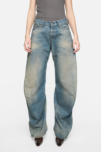 2006 jeans are cut to a relaxed fit with a low waist and wide, long legs. Crafted from rigid denim, featuring a wash with irregular bleach and dirt marks for an authentically worn-in look. - Relaxed fit - Low waist - Wide leg - Long length - 5-pocket construction - Zipper fly closure - Model is 180 cm / 5'9 and wears a size 27/34 - Style ID: ACNE STUDIOS 2006F GOLDMINE - Made from organically grown cotton - Shell: 100% Cotton, Patch: 100% Cow leather