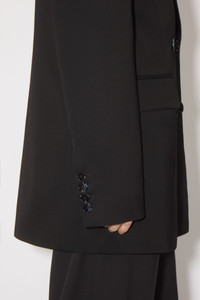 Acne Studios black single-breasted tuxedo tailored blazer is crafted from a wool blend,d detailed with a chest welt pocket and jetted flap pocket. Cut to a relaxed fit with structured shoulders and below the hip length. - Relaxed fit - Below the hip length - Shoulder pads - Double-breasted - Button-up closure - Chest pocket - Jetted flap pockets - Fully lined - Model is 177 cm / 5′9 and wears a size 36 - Style ID: FN-WN-SUIT000501 - Shell: 74% Viscose, 26% Wool, Lining: 100% Viscose, Sleeve Lining: 54% Cotton, 46% Acetate