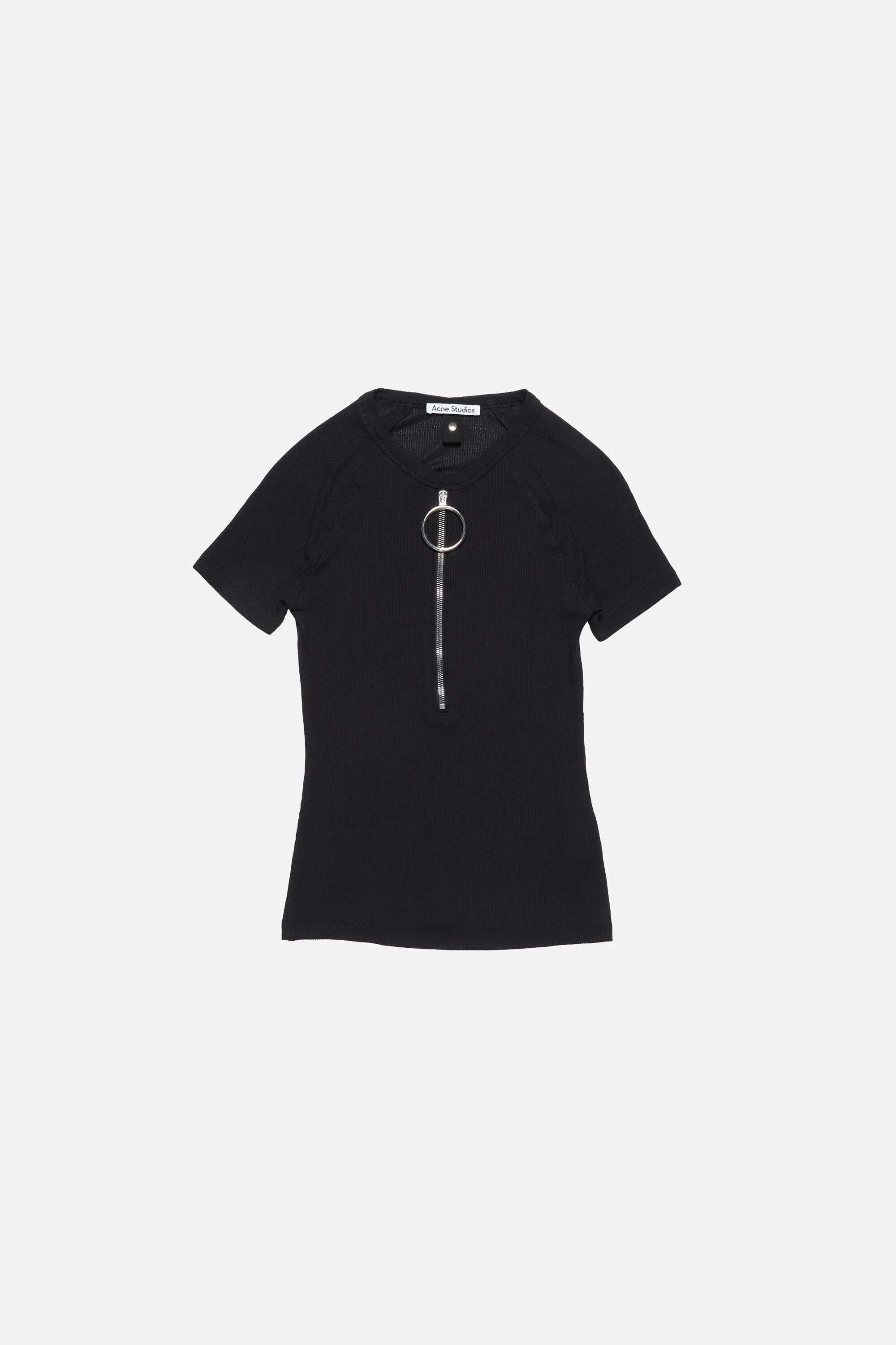 Fitted short-sleeve T-shirt crafted from lightweight ribbed fabric, featuring a zip detail with a ring pull. - Fitted silhouette - Short sleeves - Lightweight ribbed fabric - Front zip with ring pull closure - Model is 178 cm / 5'10 and wears a S - Style ID: FN-WN-TSHI000860 - Shell made with 94% LENZING™ ECOVERO™ - Shell: 96% Viscose, 4% Elastane