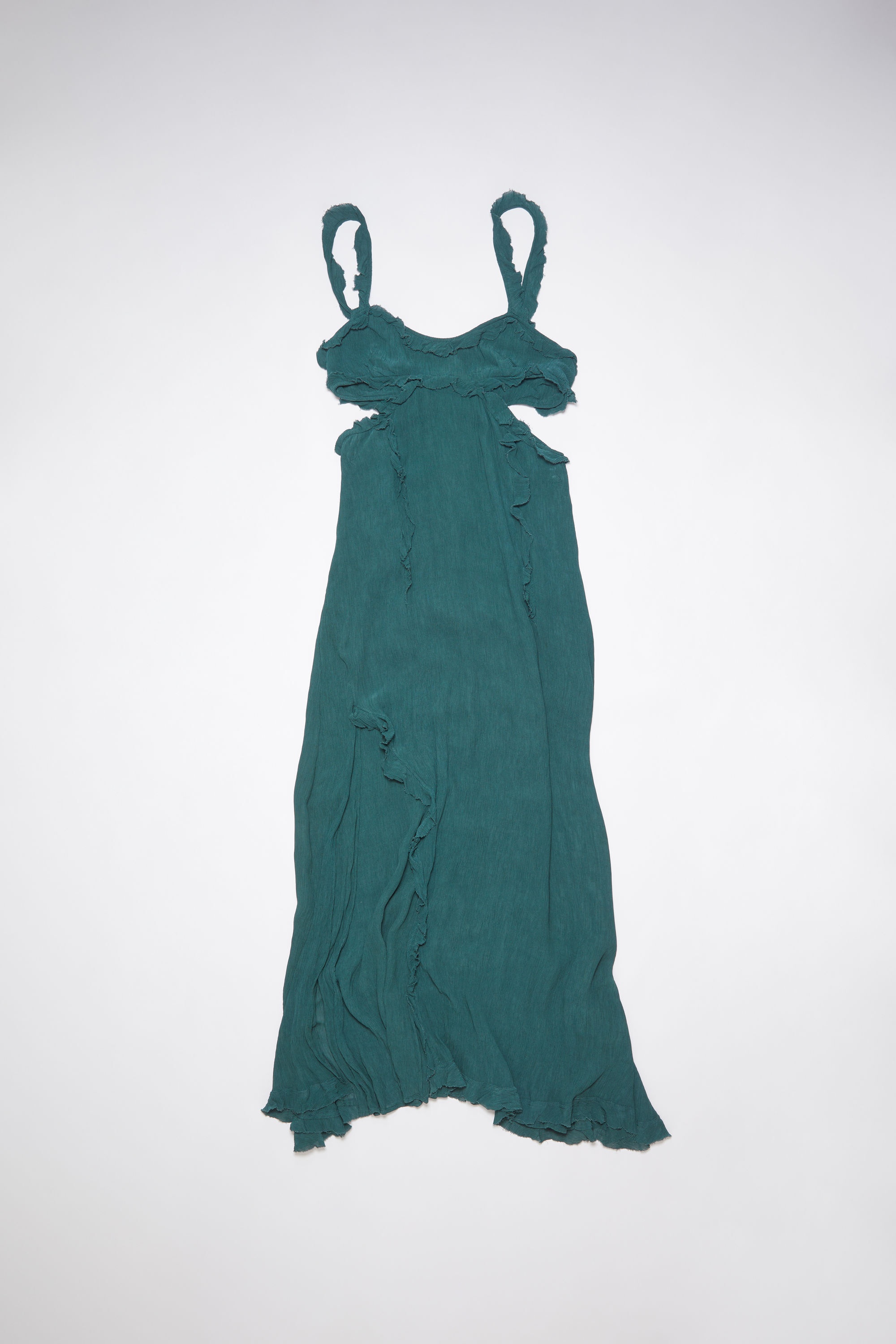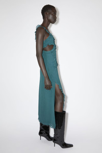 Acne Studios petrol blue slip dress is crafted from crepe fabric with a crinkled finish, detailed with ruffles, side cut-outs and a side slit. Cut to a relaxed fit and mid-length. - Relaxed fit - Mid length - Side Cut-outs - Side slit - Ruffle details - Model is 180 cm / 5'9 and wears a size 36 - Style ID: FN-WN-DRES000863 - Shell: 100% Viscose