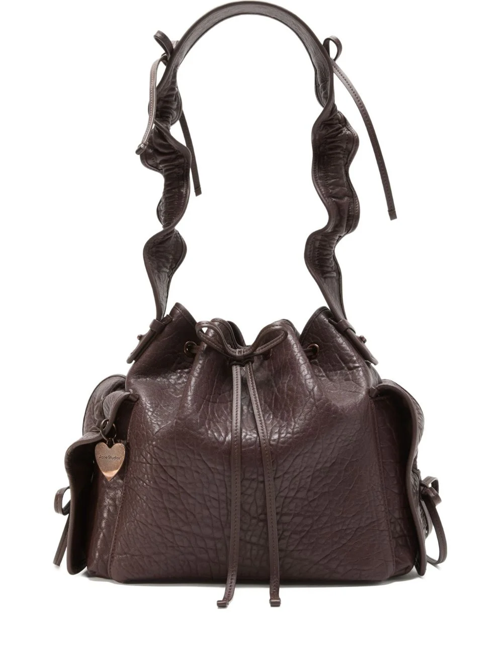 ruffled drawstring shoulder bag Highlights - Brown - Textured leather - Drawstring closure - Ruffled shoulder strap - Logo charm Made in Italy Composition Outer: Lambskin 100% Lining: Polyester 50%, Polyurethane 50% SIZE & FIT Measurement DEPTH 5.9 in(15 cm) HEIGHT 9.84 in(25 cm) STRAP 31.49 in(80 cm) WIDTH 10.43 in(26.5 cm)