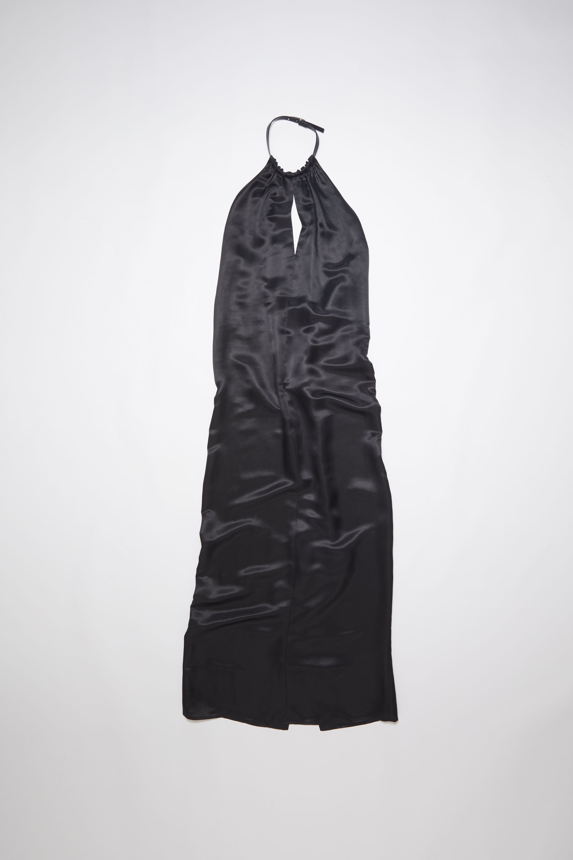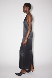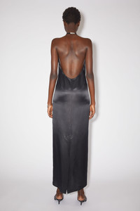Acne Studios black dress is crafted from a fluid silk blend fabric, detailed a slit on the front neckline and halter neck buckle strap closure. Cut to a relaxed fit and long length. - Relaxed fit - Long length - Buckle strap closure neckline - Front slit - Model is 180 cm / 5'9 and wears a size 36 - Style ID: FN-WN-DRES000875 - Shell: 75% Viscose, 25% Silk
