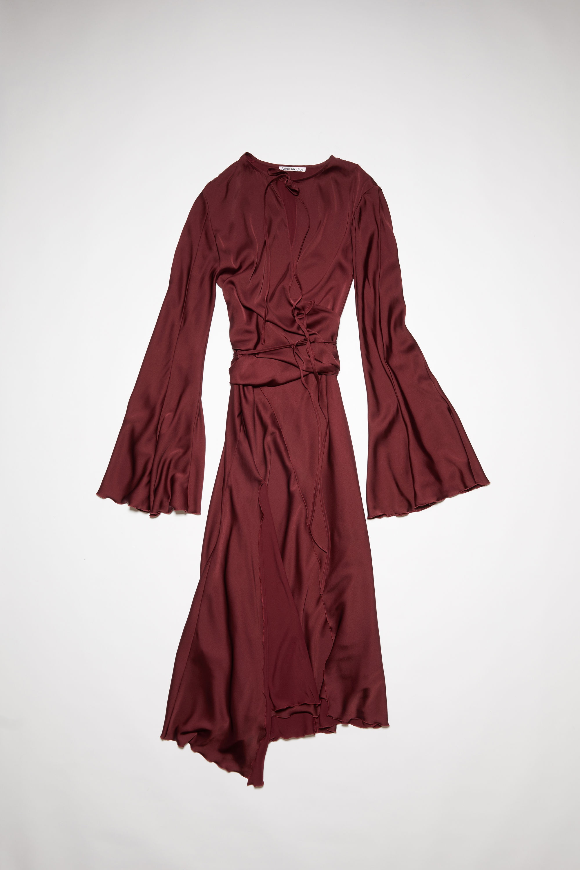 Acne Studios wine red satin dress features a wrap detailing with a front tie v-opening on the front and tie-up ribbons on the the back. Completed with flared long sleeves, side slit and asymmetric hem. Cut to a fitted silhouette with a mid length, and crafted from fluid satin fabric with a soft shine appearance. - Midi satin dress - Tie-up front and waistline detailing - Flared long sleeves - Asymmetrical hem - Side slit - Style ID: FN-WN-DRES000776 - Fitted fit - Mid length - European sizing - Model is 180cm/ 5'11 and wears a size 36 - Shell: 97% Polyester, 3% Elastane
