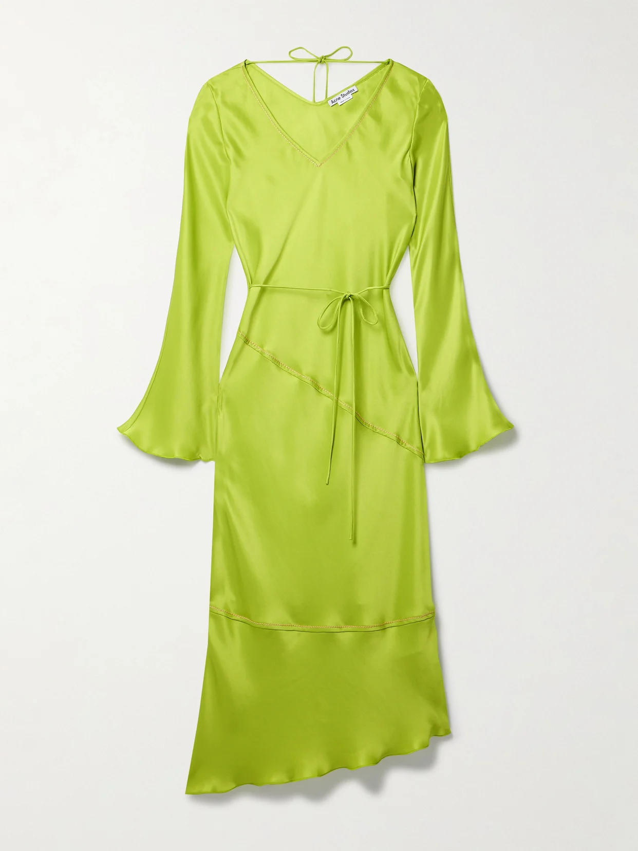 Acne Studios' midi dress is made from lime-green satin that's cut on the bias, so it effortlessly skims your curves and has topstitched seams. The flared seams and lettuce-edged asymmetric hem make it feel fresh. Use the spaghetti ties to define your waist.