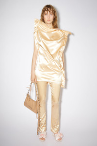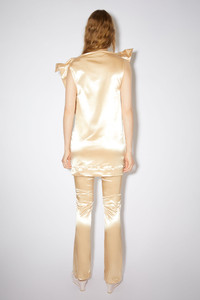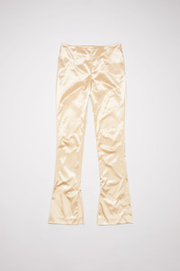 Acne Studios champagne beige trousers are crafted from a fluid satin fabric with a shiny appearance and detailed with slits at the bottom hem with a zippered closure. Cut to a fitted silhouette, low waist and long length. - Fitted fit - Low waist - Long length - Slits at the bottom hem with zippered closure - Discrete side zip closure - Model is 179 cm / 5'8 and wears a size 36 - Style ID: FN-WN-TROU000985 - Shell: 94% Nylon, 6% Elastane