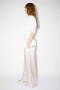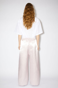 Acne Studios light pink trousers feature an Acne Studios embroidery, detailed with an elasticated waist and side pockets. Crafted from a satin fabric with a luminous finish. Cut to a relaxed fit and long length. - Relaxed fit - Long Length - Elasticated waist - Acne Studios embroidery - Side pockets - Model is 178 cm / 5'8 and wears a size 36 - Style ID: FN-WN-TROU000965 - Shell: 77% Cotton, 23% Nylon, Lining: 100% Viscose