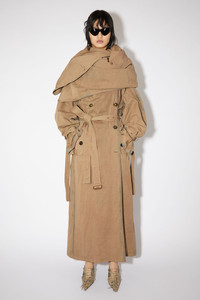 Acne Studios beige double-breasted trench coat is crafted from twill cotton with a structured finish. Complete with an exaggerated shawl collar, trench coat details, button, and belt closure. Cut to a relaxed fit and mid-length. - Relaxed fit - Mid-length - Double-breasted - Exaggerated shawl collar - Button and belt closure - Front flap pockets - Trench coat detailed - Model is 177 cm / 5′9 and wears a size 36 - Style ID: FN-WN-OUTW000876 - Made from organically grown cotton. - Shell: 100% Cotton