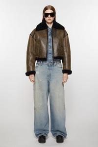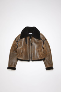 Acne Studios dark brown/black jacket is crafted from merino shearling and crackled finish leather. Complete with zipper front closure and welt pockets. Cut to a relaxed fit and waist length. - Relaxed fit - Waist length - Shirt collar - Zipper closure - Front welt pockets - Adjustable straps at the neck - Model is 178 cm / 5′10 and wears a size 36 - Style ID: FN-WN-LEAT000289 - Shell: 100% Lamb shearling