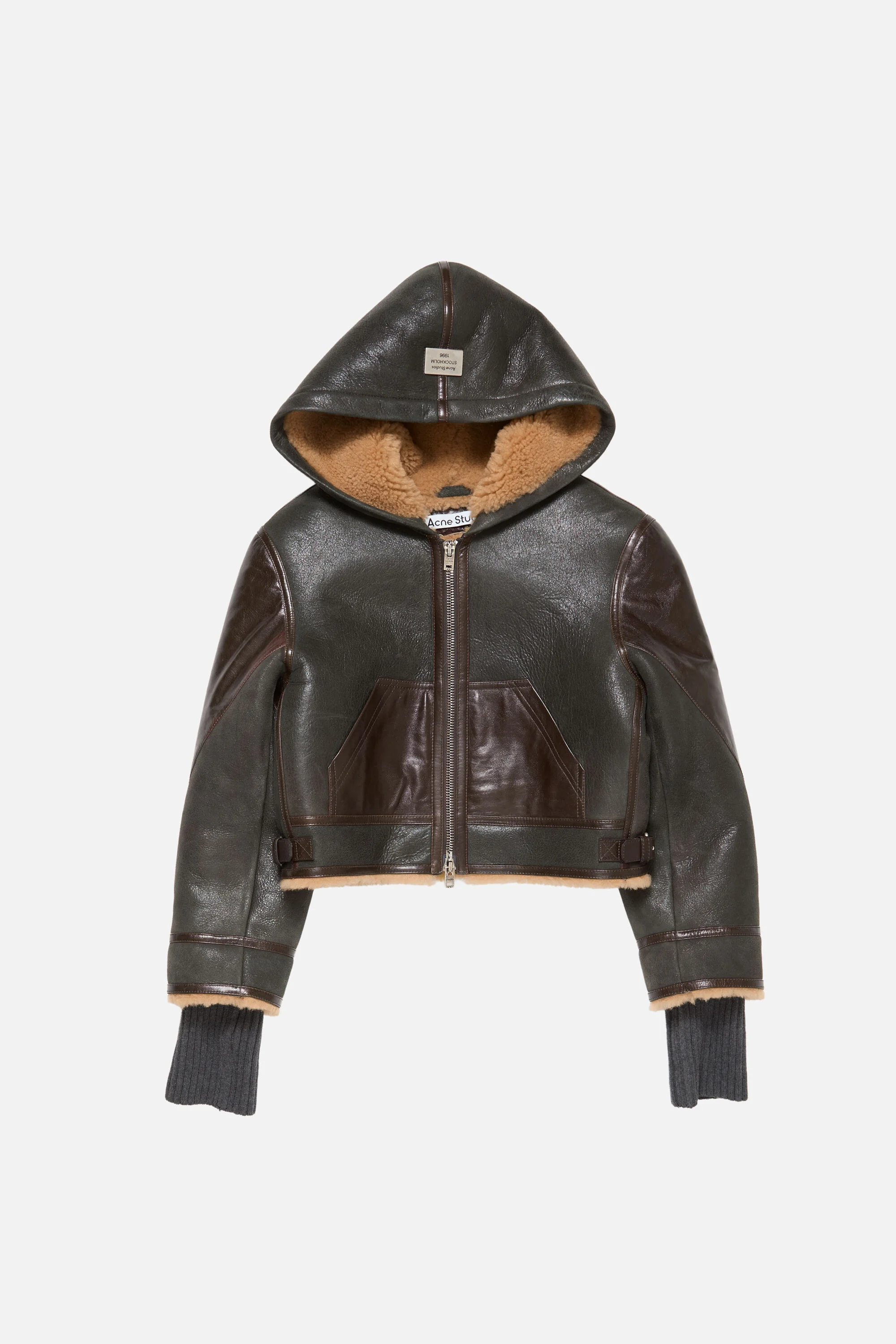 Shearling jacket with a hood and contrast panel detailing. Designed with elongated jersey sleeves, adjustable waist tabs, and a metal logo plaque on the hood. Cut to a fitted silhouette and waist length. - Fitted style - Waist length - Contrasting jersey sleeves - Hood with metal logo plaque - Two-way zip closure - Model is 179 cm / 5'9 and wears a size XS - Style ID: FN-WN-LEAT000437 - Shell made from leather from a Leather Working Group (LWG) certified tannery with Silver rating - Shell: 100% Lamb shearling, Contrast: 100% Buffalo leather