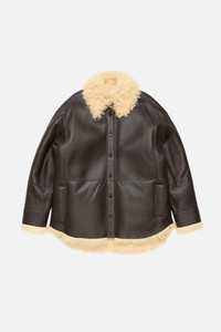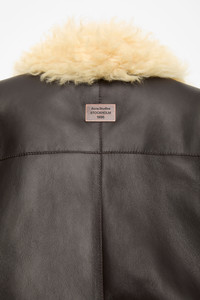 Shirt jacket crafted from full-grain leather with soft shearling lining. Features a center front button-up closure, side welt pockets, and an Acne Studios metal plaque at the back neckline. Cut to a relaxed fit and below-hip length. - Relaxed fit - Below-hip length - Acne Studios metal plaque - Side welt pockets - Button-up closure - Model is 180 cm / 5'9 and wears a size 38 - Style ID: FN-WN-LEAT000455 - Shell made from leather from a Leather Working Group (LWG) certified tannery with Silver rating - Shell: 100% Lamb shearling