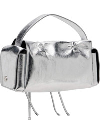 Crinkled leather top handle bag. · Logo embossed at adjustable shoulder strap · Detachable crossbody strap · Logo charm and drawstrings at face · Flap pocket at sides · Magnetic flap · Patch pocket at interior · H6" x W14" x D4.5" Supplier color: Silver Leather. Made in Italy 261129F046000