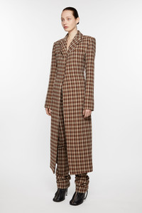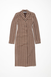Single-breasted coat from the FW24 show collection crafted in a wool blend features a boucle check pattern. Cut to fitted silhouette, defined waistline with dart details and long length. - Fitted fit - Dart hourglass cut - Long length - Single breasted - Boucle check - Discrete button-up closure - Front chest pockets - Centre back vent - Model is 180cm/ 5'11 and wears a size 36 - Style ID: FN-WN-OUTW000989 - Shell: 28% Wool, 22% Cotton, 19% Viscose, 18% Polyester, 12% Nylon, 1% Elastane, Lining: 64% Viscose, 36% Polyester