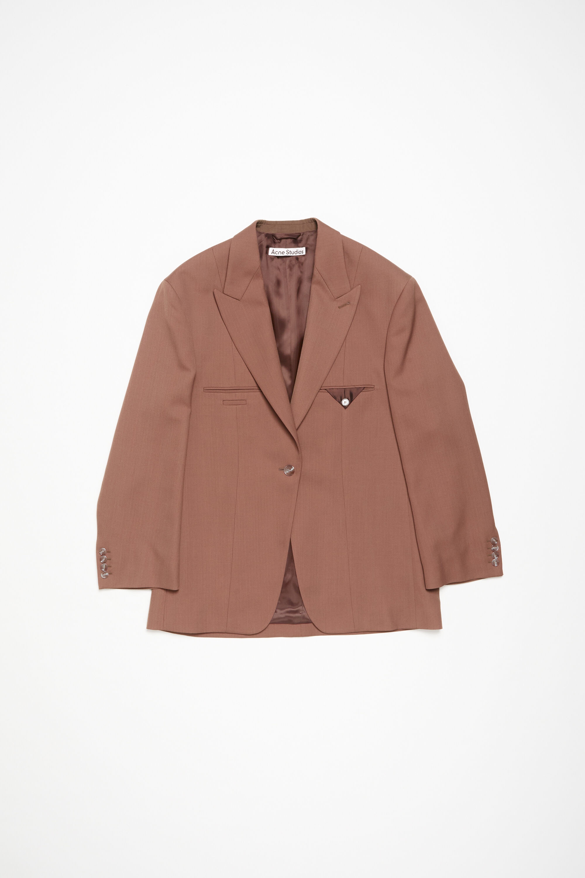 Tailored single-breasted suit jacket is cut to a relaxed fit with dropped unconstructed shoulders and mid thigh length. Crafted from a wool blend with an inside-out inspired construction. - Relaxed fit - Below hip length - Dropped unconstructed shoulders - Button closure - Chest pockets - Full lining - Model is 177 cm / 5′10 and wears a size 36 - Style ID: FN-WN-SUIT000591 - Main material made from recycled polyester. - Shell: 55% Polyester, 45% Wool, Lining: 100% Viscose