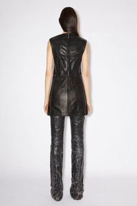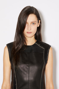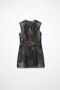Acne Studios black dress is crafted from semi-aniline-grained leather with a lightly pigmented finish and patchwork detailing. Cut to a regular fit with a slight hourglass silhouette, crew neckline and mid-thigh length. - Regular fit - Hourglass - Mid-thigh length - Crew neck - Patchwork leather with pigment finish - Discrete zipper closure at back - Fully lined - Model is 180 cm / 5′11 and wears a size 36 - Style ID: FN-WN-DRES001070 - Shell: 100% Cow leather, Shell: 100% Lamb leather, Shell: 100% Lamb leather, Lining: 100% Viscose