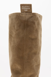 Slouch saddle boots crafted from soft suede, featuring a front saddle strap and a branded leather tag on the shaft. Softly constructed with a flexible polyurethane sole for comfort. - Suede saddle boots - Front saddle strap - Branded leather tag - Flexible polyurethane sole - Sole height: 5 mm - Style ID: AC-WN-SHOE000018 - Uppers: 100% Calf leather, Lining: 100% Lamb leather, Soles: 100% Thermoplastic polyurethane