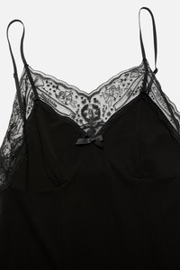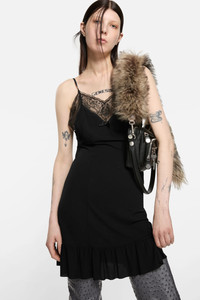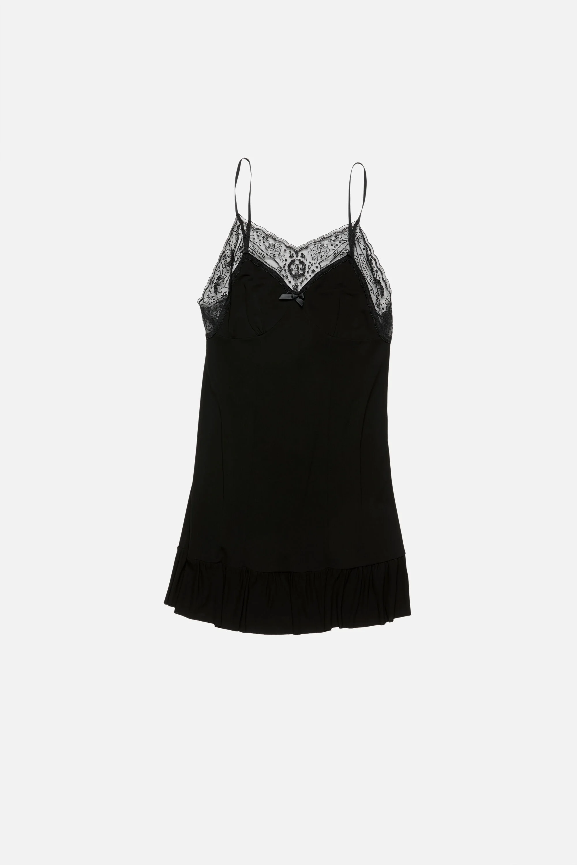 Strap dress crafted from lightweight, fluid fabric with double-layered lace detailing and ruffled hem. Cut to a regular fit and mid-thigh length. - Regular fit - Mid-thigh length - Adjustable straps - Double-layered lace detail - Ruffled hem - Model is 180 cm / 5'9 and wears a size 36 - Style ID: FN-WN-DRES001489 - Shell: 100% Viscose, Contrast: 100% Nylon