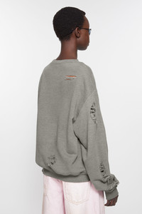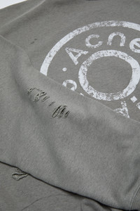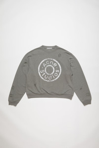 Crew neck sweater features a seasonal Acne Studios button screen print logo on the front, adorned with distressed details and an overall garment-dyed finish. Cut to a relaxed unisex fit with dropped shoulders, extra long sleeve length and below hip length. - Relaxed unisex fit - Dropped shoulders - Extra long sleeve length - Below hip length - Acne Studios button logo screen print - Destroyed details - Ribbed neckline, cuffs and hem - Female model is 180 cm / 5′11″ and wears a size S - Male model is 188.5 cm/ 6'2 and wears a size M - Style ID: FN-UX-SWEA000044 - Made with organically grown cotton and recycled polyester. - Shell: 85% Organic cotton, 15% Recycled polyester