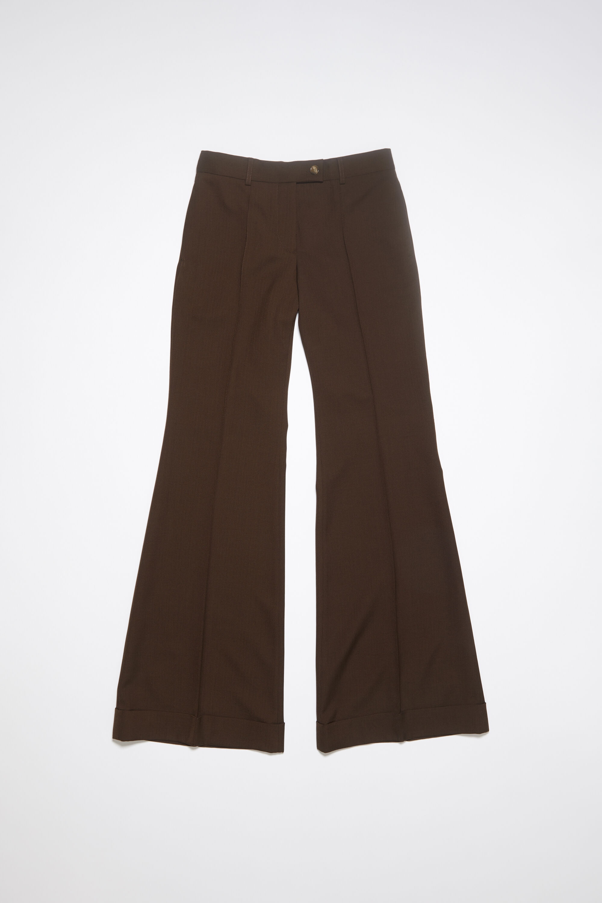 Acne Studios chestnut brown tailored trousers are crafted from a wool blend, detailed with front topstitched leg pleats and fold-up hem. Complete with side pockets and back welt pockets. Cut to a regular fit with a mid-waist, flared leg and long length. - Regular fit - Mid waist - Flared leg - Long length - Front topstitch pleats - Fold up hem - Side pockets - Back welt pockets - Zip fly - Model is 177 cm / 5′9 and wears a size 36 - Style ID: FN-WN-TROU001062 - Main material made from recycled polyester., Lining made from organically grown cotton. - Shell: 55% Polyester, 45% Wool, Pocket Lining: 100% Cotton
