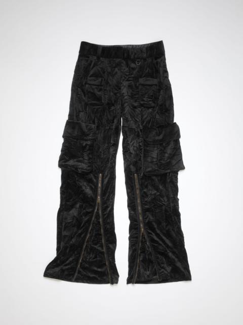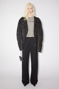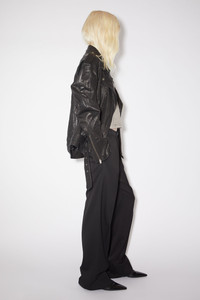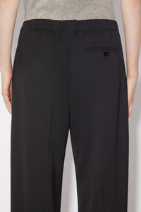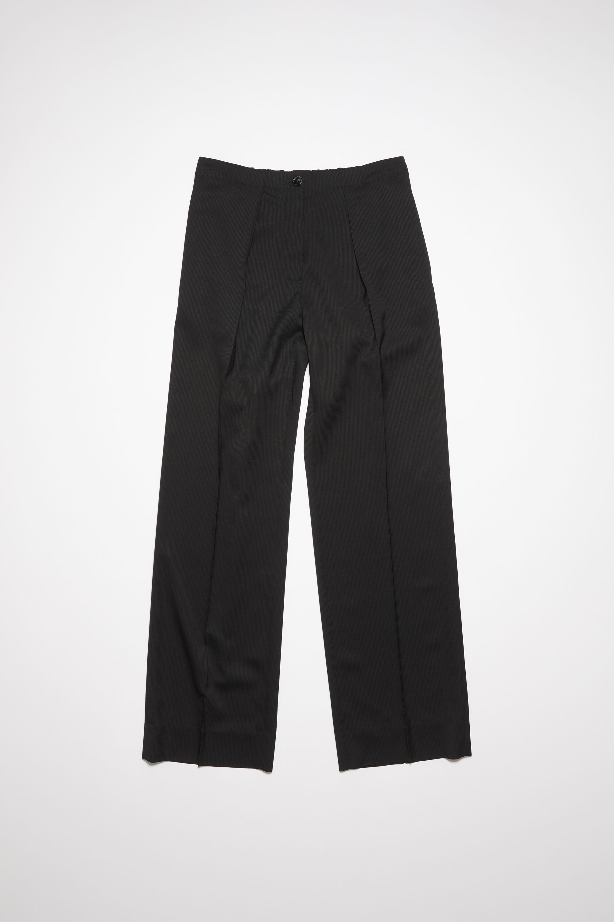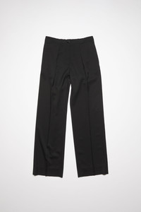 Acne Studios black suit trousers are crafted from a herringbone wool blend, detailed with pressed crease at the front and pleats at the waist. Cut to a relaxed fit with a mid-waist, wide leg and long length. - Relaxed fit - Mid waist - Wide leg - Long length - Pressed crease - Pleats at waist - Side pockets - Back button pocket - Model is 178 cm / 5′10 and wears a size 36 - Style ID: FN-WN-TROU001049 - Shell: 74% Viscose, 26% Wool, Pocket Lining: 100% Cotton