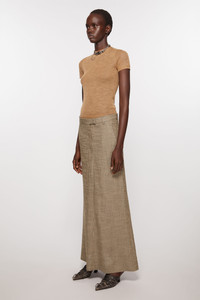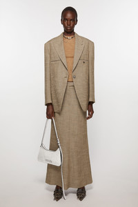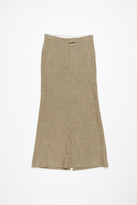 Suit skirt is cut to a regular fit with a mid waist and long length. Crafted from a linen blend with check pattern. Detailed with an Acne Studios logo patch and slit on the back. - Regular fit - Mid waist - Long length - Slit centre back seam - Acne Studios logo patch centre back - Front pockets - Zip fly and button closure - Fully lining - Model is 181 cm / 6' and wears a size 36 - Style ID: FN-WN-SKIR000678 - Made from recycled polyester. - Shell: 60% Linen, 26% Viscose, 14% Polyester, Pocket Lining: 100% Viscose