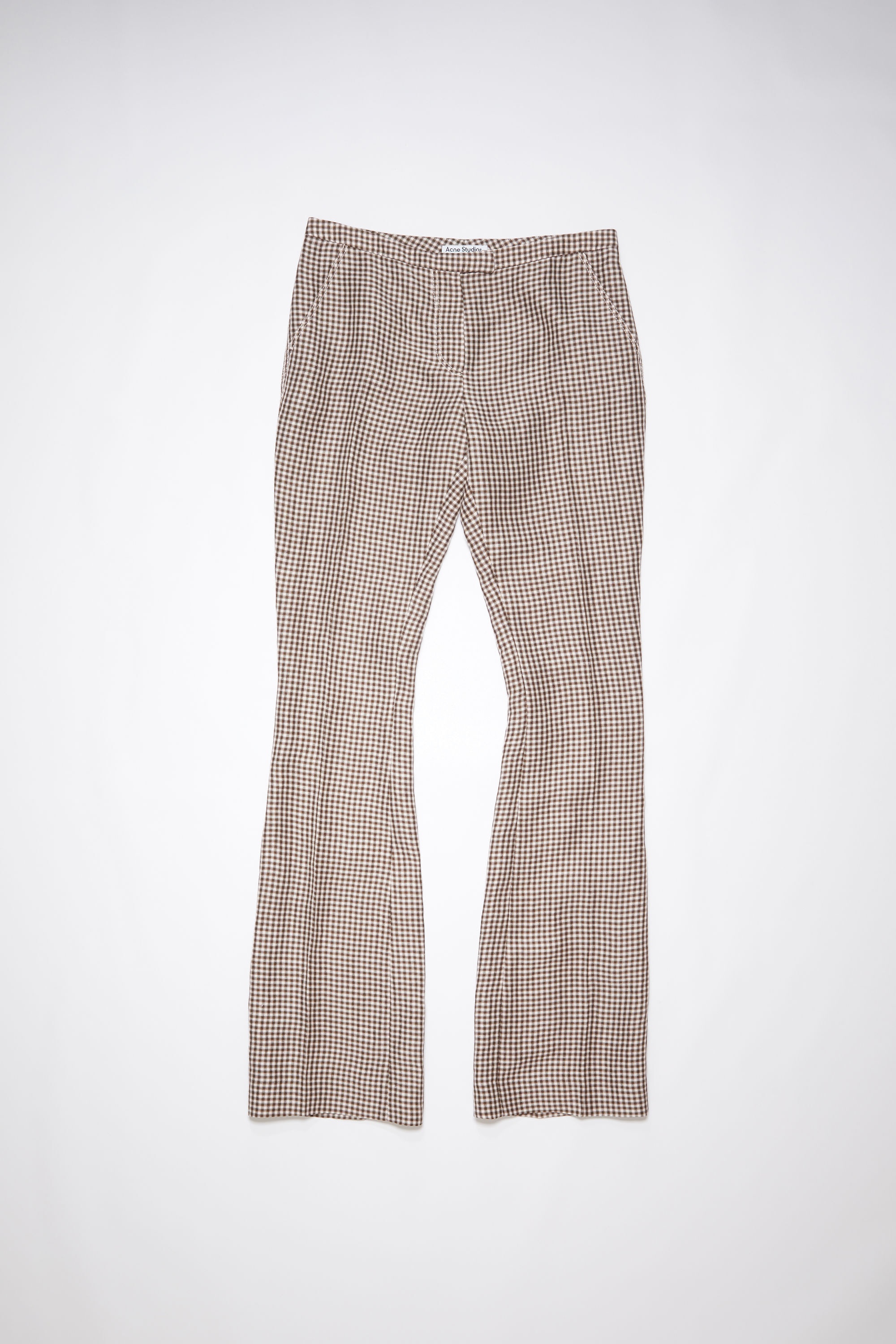Acne Studios brown/white tailored trousers feature an all-over gingham pattern crafted from line-blend, complete with side pockets and a back pocket. Cut to a regular fit with a low rise, flared leg and long length. - Regular fit - Low waist - Flared leg - Long length - Gingham - Front side pockets - Back welt pocket - Zipper fly - Model is 179 cm / 5'8 and wears a size 36 - Style ID: FN-WN-TROU000970 - Shell: 59% Linen, 41% Viscose, Pocket Lining: 100% Viscose