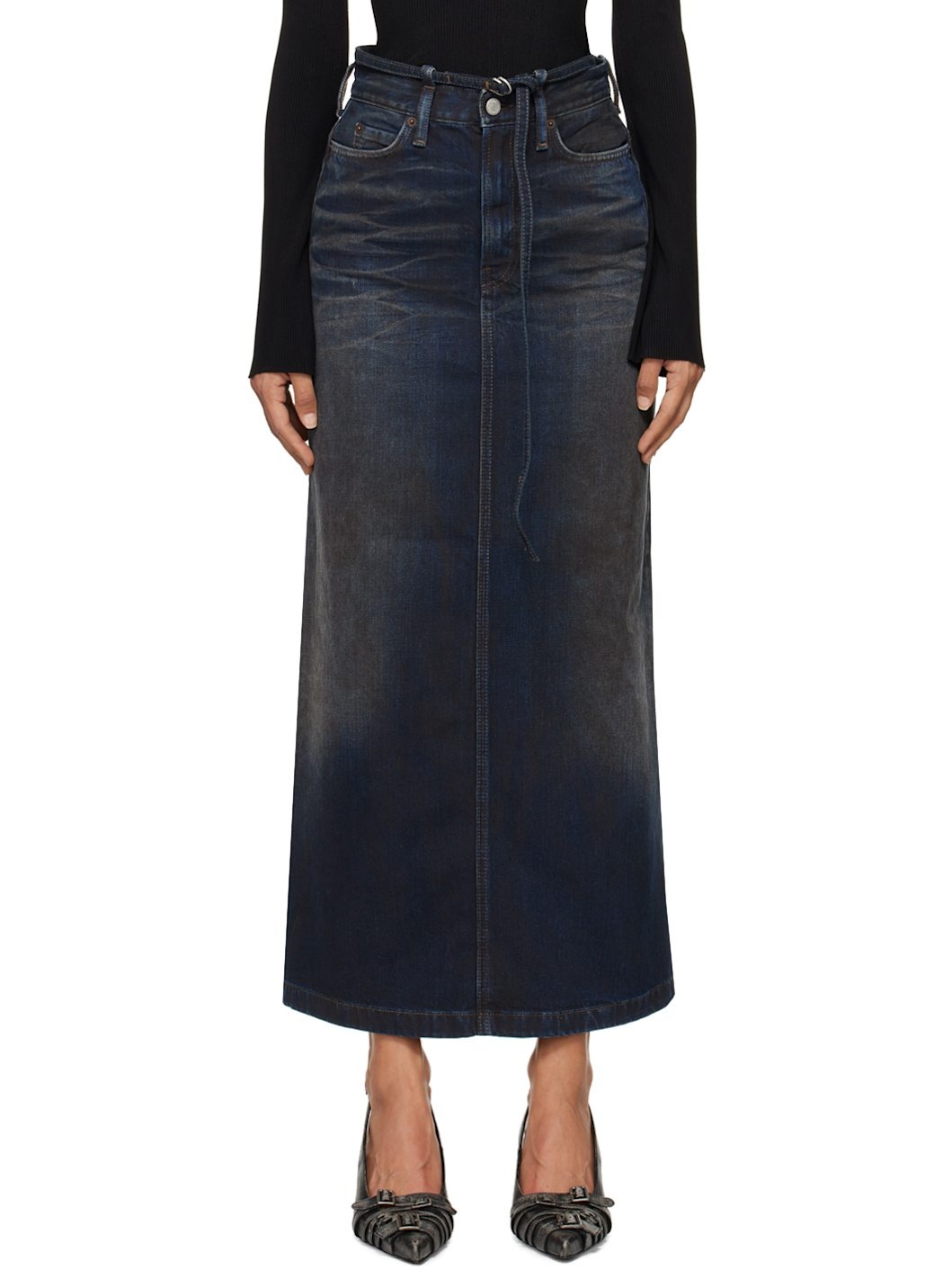 Non-stretch denim maxi skirt. Fading and whiskering throughout. · Paneled construction · Detachable cinch belt · Five-pocket styling · Zip-fly · Logo patch at back waistband · Central vent at back hem Supplier color: Dark blue