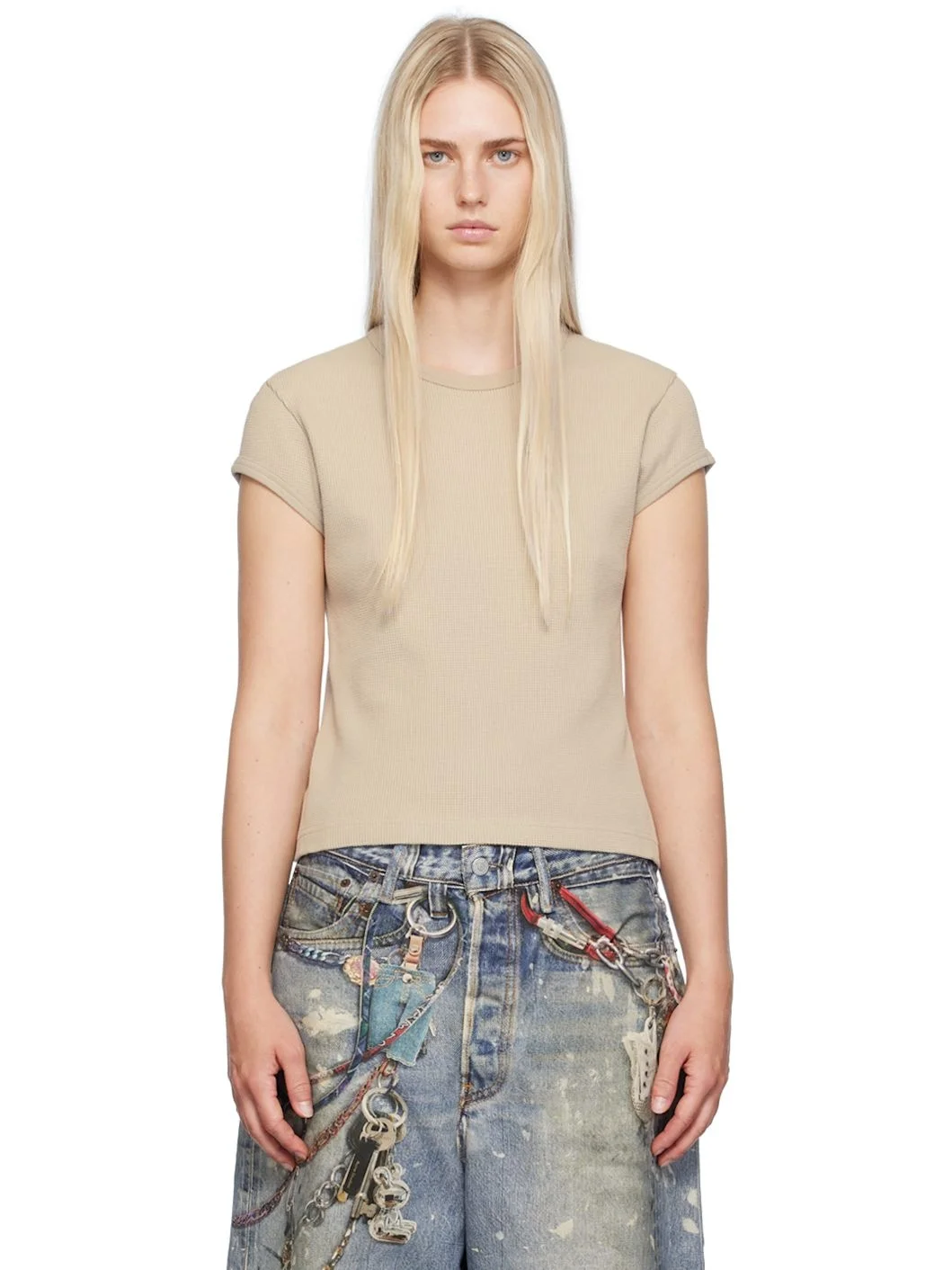 Garment-dyed waffle knit organic cotton T-shirt. · Rib knit crewneck and cuffs · Cap sleeves · Rubberized logo patch at back Supplier color: Bright gray 100% organic cotton. Made in Portugal 242129F110022