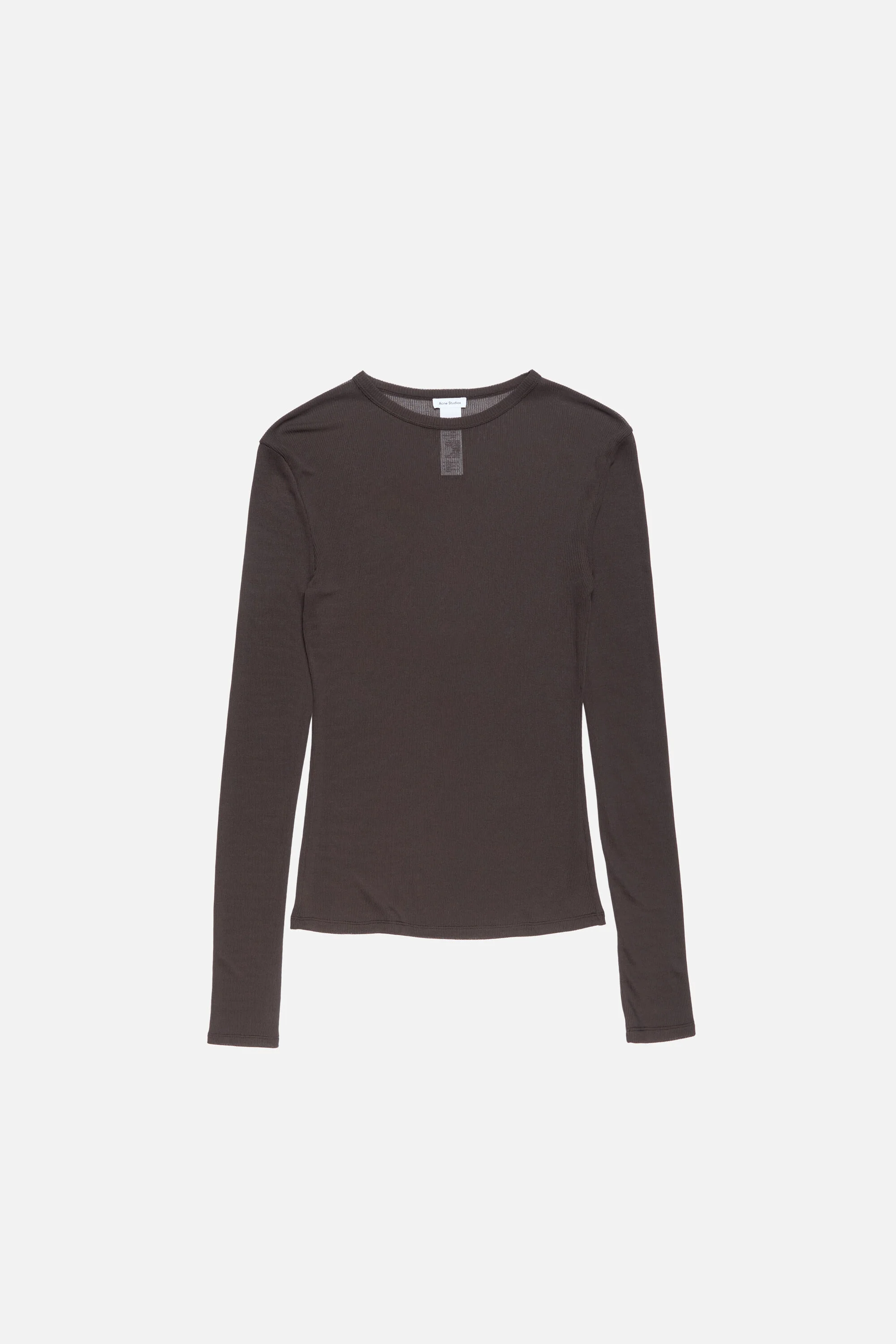 Crewneck long-sleeve T-shirt crafted from thin, fluid ribbed fabric, finished with a logo tag at the back neckline. Cut to a fitted silhouette and hip length. - Crewneck T-shirt - Fitted - Hip length - Long-sleeves - Model is 179 cm / 5'11 and wears a S - Style ID: RW-WN-TSHI000003 - Shell: 82% Viscose, 18% Nylon