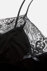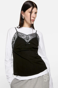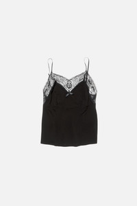 Strap blouse crafted from lightweight, fluid fabric with lace detailing. Features adjustable elastic shoulder straps and a small bow at the front. Cut to a regular fit and hip length. - Regular fit - Hip length - Adjustable shoulder straps - Lace detailing - Model is 180 cm / 5'9 and wears a size 36 - Style ID: FN-WN-BLOU001165 - Shell: 100% Viscose, Contrast: 100% Nylon