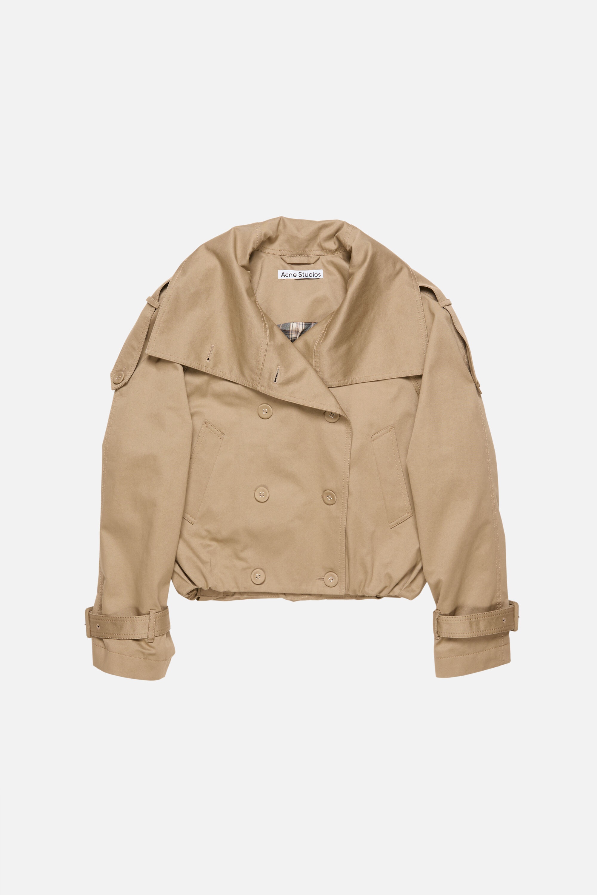 Jacket crafted from cotton with a twill structure, featuring an elongated neckline and pleated finishes at the bottom hem. Detailed with trench-style tabs at the shoulders and belts at the sleeve cuffs. Complete with leather logo patch on back neckline. Cut to a relaxed fit and below-waist length. - Relaxed fit - Below waist - Button-up closure - Front and interior pockets - Pleated hem - Belt details on cuffs - Acne Studios logo patch - Model is 177 cm / 5'8 and wears a size 36 - Style ID: FN-WN-OUTW001104 - Made from organically grown cotton - Shell: 100% Cotton, Lining: 100% Cotton, Sleeve Lining: 100% Viscose