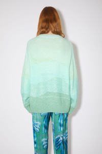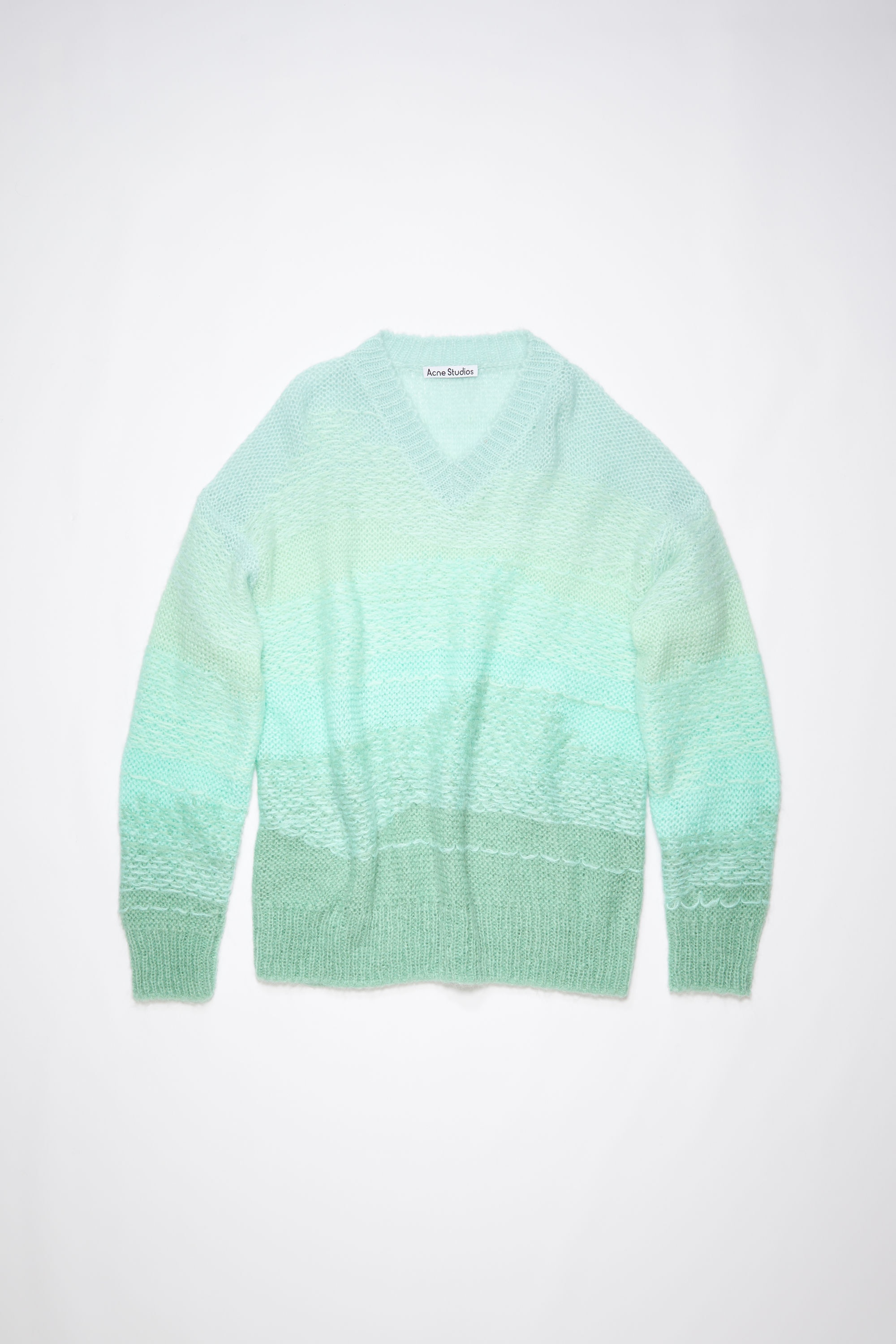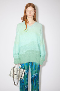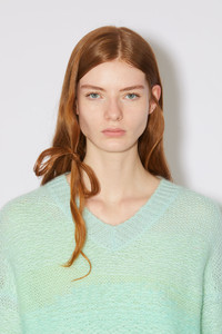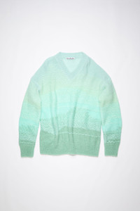 Acne Studios mint/multi jumper features reverse knit detailing with an ombre appearance, crafted from a lightweight mohair blend. Cut to a relaxed fit with a v-neckline. - Relaxed fit - V-neckline - Hip length - Reverse knit with float stitching - Model is 178 cm / 5'8 and wears a size S - Style ID: FN-WN-KNIT000440 - Shell: 38% Acrylic, 32% Nylon, 30% Mohair